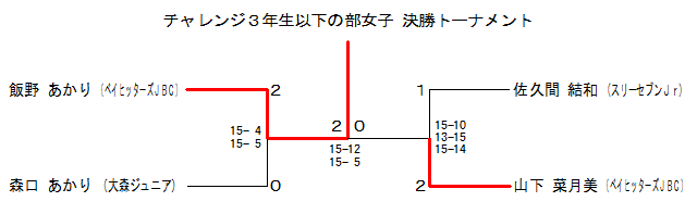 | H-2 | ベイヒッターズJBC | 山下菜月美 | 2 | 15-10 13-15 15-14 | 1 | 佐久間結和 | スリーセブンJr | |
